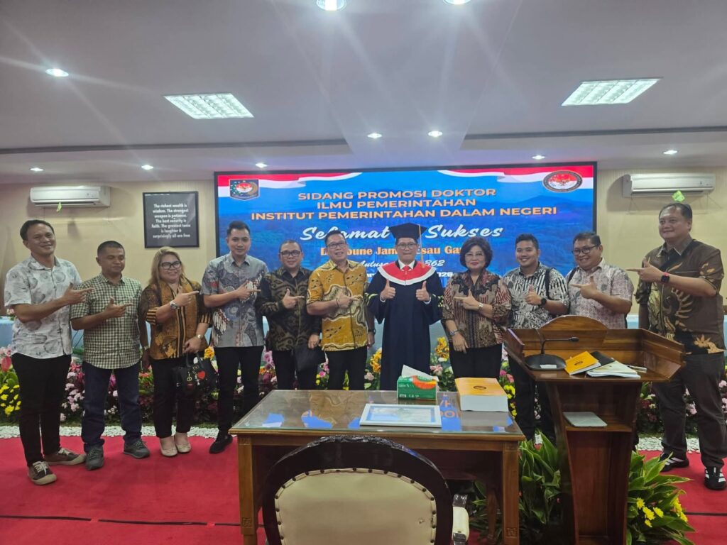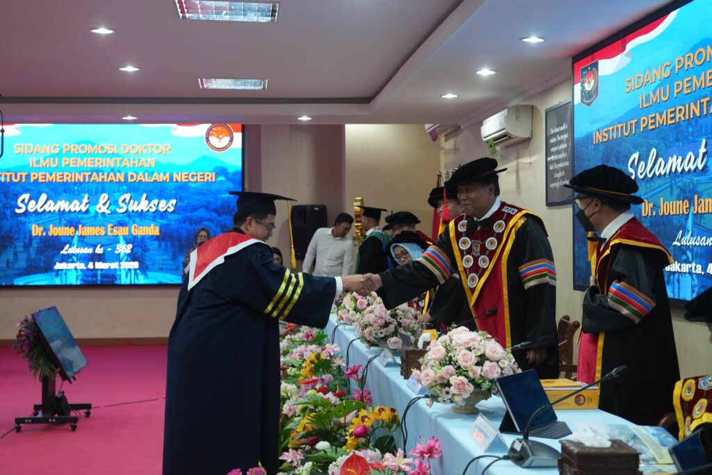 ReportaseIndo.comMINUT–Bupati Minahasa Utara, Joune Ganda SE MAP MM MSi resmi meraih gelar Doktor dalam Sidang Promosi Doktor yang diselenggarakan di lingkungan Institut Pemerintahan Dalam Negeri (IPDN), Rabu (4/3) sore tadi.
